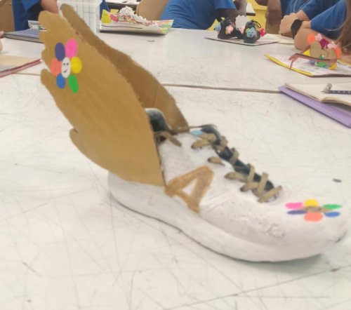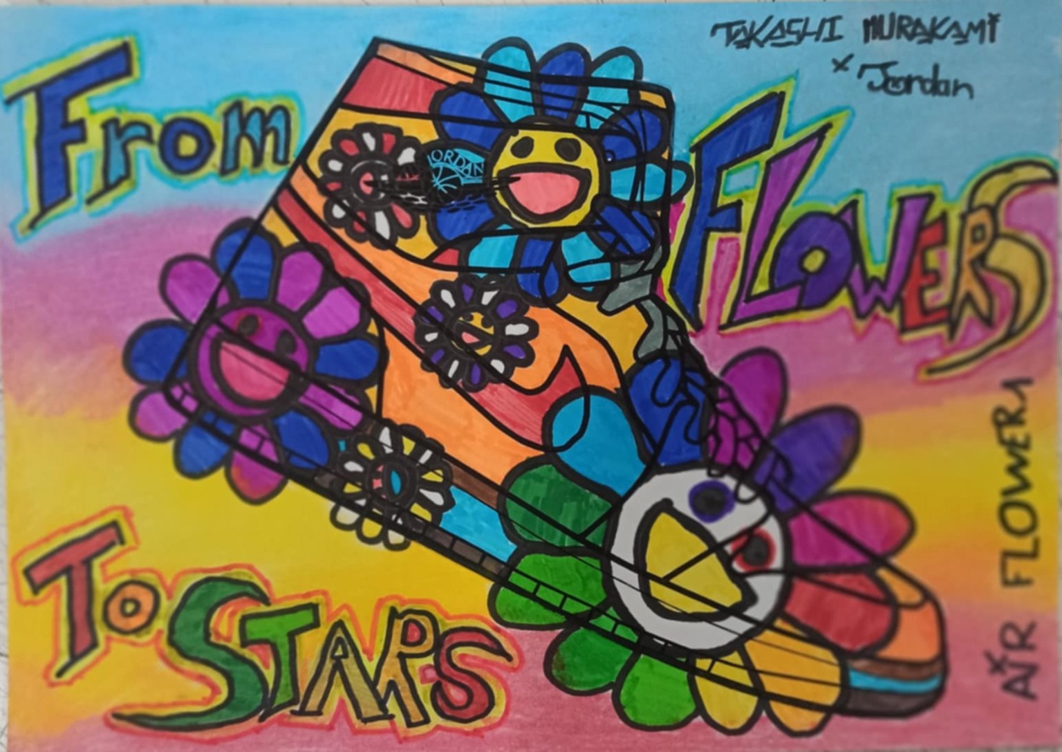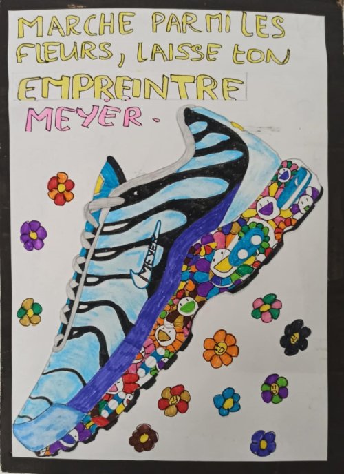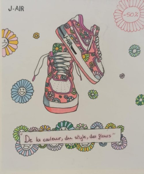 Pour ce projet les élèves de 4ème devaient sélectionner un accessoire de mode tel qu’une paire de lunette, une basket ou une casquette pour en faire la publicité, assortie d’une série limité tirée de l’univers floral de l’artiste Takashi Murakami.