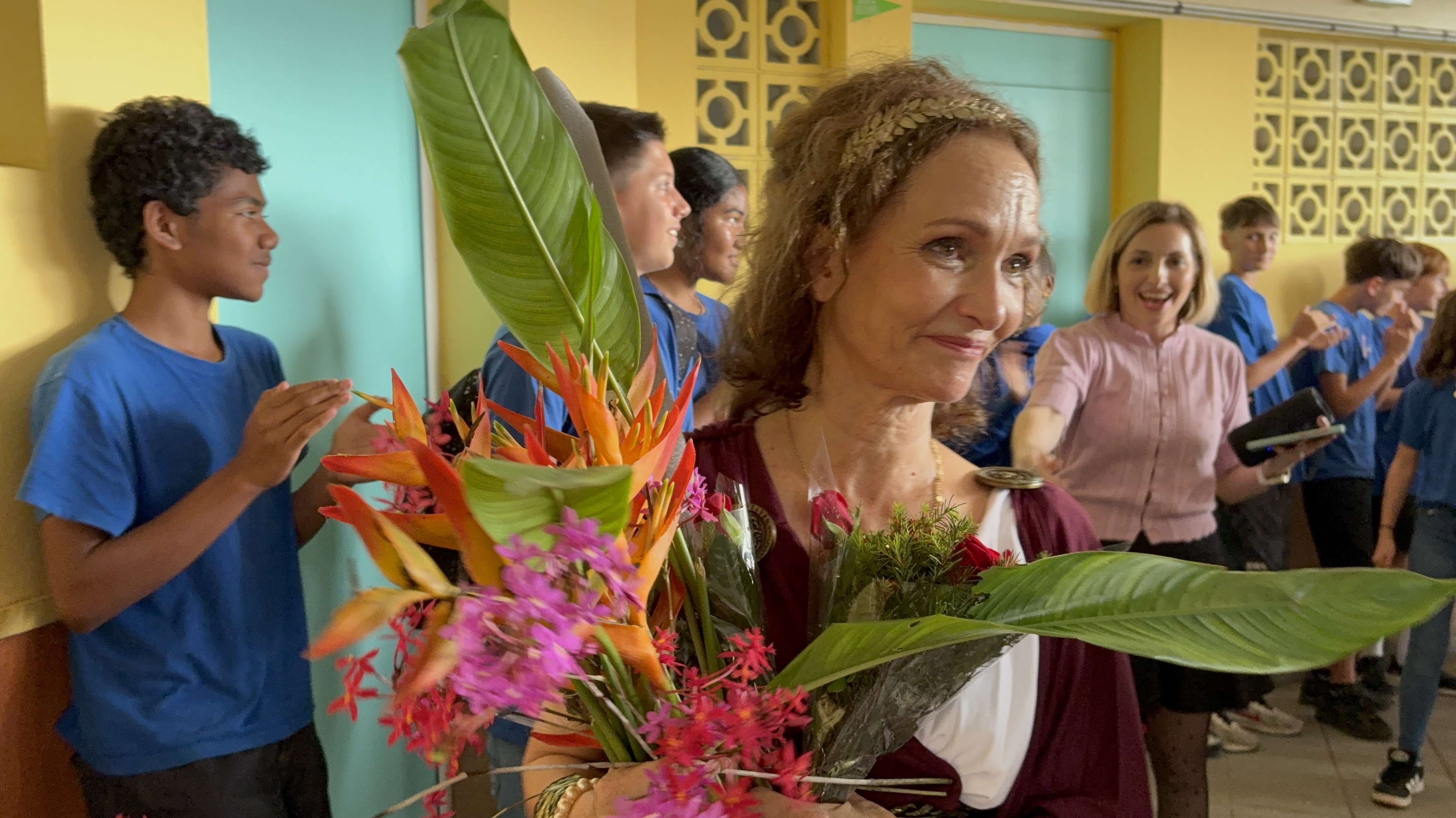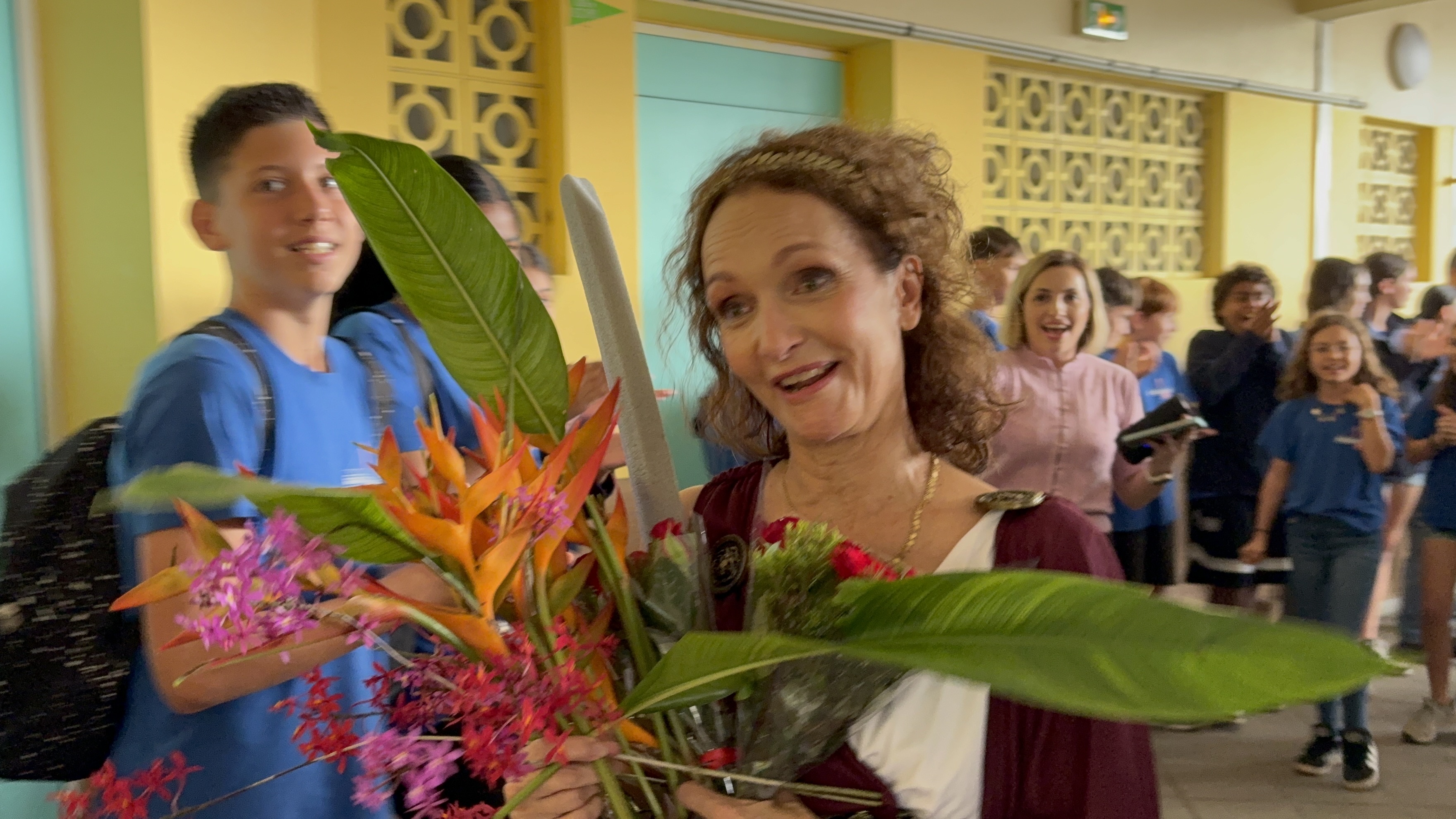 Le deuxième départ fut celui de Mme Servent, professeure de français, qui prend une retraite bien méritée après plus de 20 ans passés au sein de l’établissement. Ses collègues lui avaient préparé plusieurs défis pour sa dernière journée, dont le plus mémorable : revêtir un costume de déesse Athéna et assurer ses cours ainsi habillée, au grand plaisir des élèves. La journée s’est achevée dans l’émotion avec un chant d’adieu et une haie d’honneur surprise organisée par les élèves.